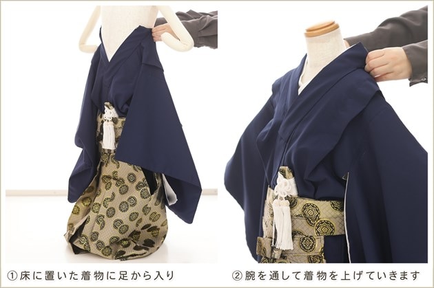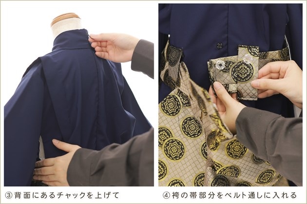 1・足袋を履いて、着物のチャックを広げる 2・着物を置いて足から入る 3・手を通してチャックを一番上まで上げ、袴の紐をベルトを通す 4・3つのボタンを留めて、羽織を着せたら完成! (※チャックは型崩れしないように少し硬め仕様になっております。) ※約90秒で誰でも簡単に着付けが可能です ※付属のサスペンダーで身長に合わせて袴の長さ調整も可能です ◆着せ方の簡易動画はこちらから