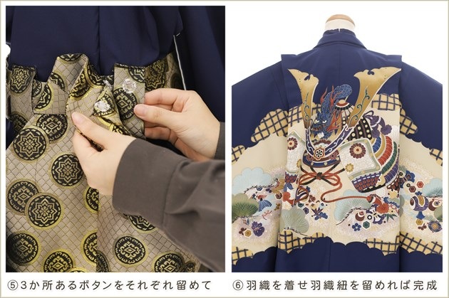 初めて着付けをする方でも商品ページの画像を見るだけで簡単に着用いただけますが 画像4番・5番の「袴の留め方について・サスペンダー調整方法」は詳細画像での説明書と動画QRコードを同封しております