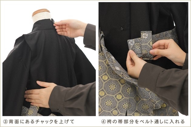 1・足袋を履いて、着物のチャックを広げる 2・着物を置いて足から入る 3・手を通してチャックを一番上まで上げ、袴の紐をベルトを通す 4・3つのボタンを留めて、羽織を着せたら完成! (※チャックは型崩れしないように少し硬め仕様になっております。) ※約90秒で誰でも簡単に着付けが可能です ※付属のサスペンダーで身長に合わせて袴の長さ調整も可能です ◆着せ方の簡易動画はこちらから