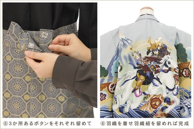 初めて着付けをする方でも商品ページの画像を見るだけで簡単に着用いただけますが 画像4番・5番の「袴の留め方について・サスペンダー調整方法」は詳細画像での説明書と動画QRコードを同封しております