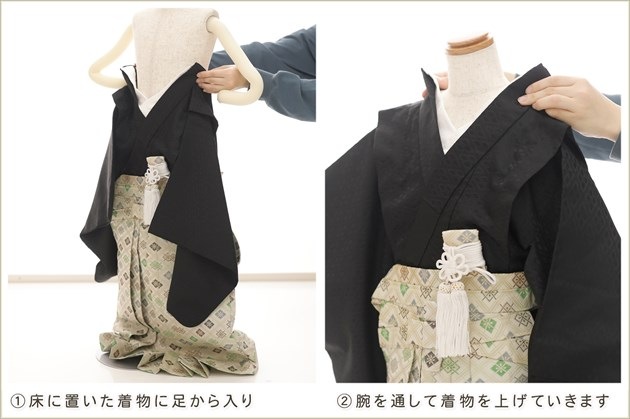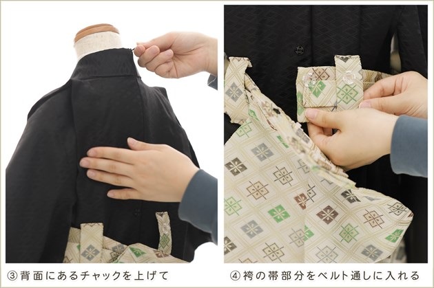 1・足袋を履いて、着物のチャックを広げる 2・着物を置いて足から入る 3・手を通してチャックを一番上まで上げ、袴の紐をベルトを通す 4・3つのボタンを留めて、羽織を着せたら完成! (※チャックは型崩れしないように少し硬め仕様になっております。) ※約90秒で誰でも簡単に着付けが可能です ※付属のサスペンダーで身長に合わせて袴の長さ調整も可能です ◆着せ方の簡易動画はこちらから