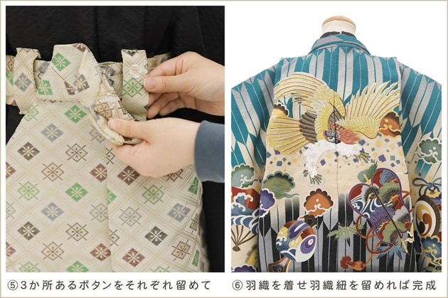初めて着付けをする方でも商品ページの画像を見るだけで簡単に着用いただけますが 画像4番・5番の「袴の留め方について・サスペンダー調整方法」は詳細画像での説明書と動画QRコードを同封しております