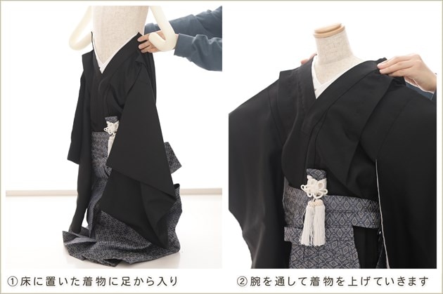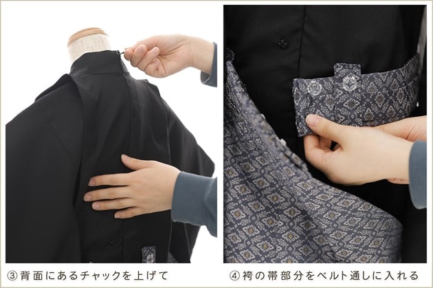 1・足袋を履いて、着物のチャックを広げる 2・着物を置いて足から入る 3・手を通してチャックを一番上まで上げ、袴の紐をベルトを通す 4・3つのボタンを留めて、羽織を着せたら完成! (※チャックは型崩れしないように少し硬め仕様になっております。) ※約90秒で誰でも簡単に着付けが可能です ※付属のサスペンダーで身長に合わせて袴の長さ調整も可能です ◆着せ方の簡易動画はこちらから
