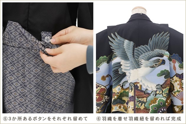 初めて着付けをする方でも商品ページの画像を見るだけで簡単に着用いただけますが 画像4番・5番の「袴の留め方について・サスペンダー調整方法」は詳細画像での説明書と動画QRコードを同封しております