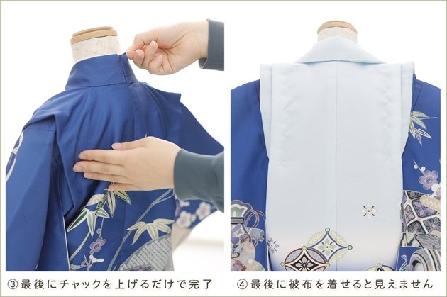 1・足袋を履いて、着物のチャックを広げる 2・着物を置いて足から入る 3・手を通してチャックを一番上まで上げ、被布を着せて完了 (※チャックは型崩れしないように少し硬め仕様になっております。) ※約10秒(最短5秒)で簡単に着付けが可能です ※丈が長い場合は付属のウェストベルトでサイズ調整が可能です