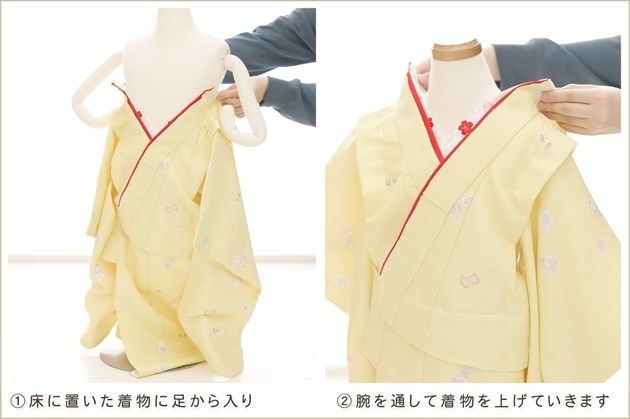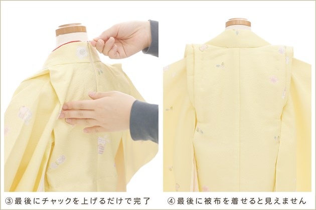 1・足袋を履いて、着物のチャックを広げる 2・着物を置いて足から入る 3・手を通してチャックを一番上まで上げ、被布を着せて完了 (※チャックは型崩れしないように少し硬め仕様になっております。) ※約10秒(最短5秒)で簡単に着付けが可能です ※丈が長い場合は付属のウェストベルトでサイズ調整が可能です