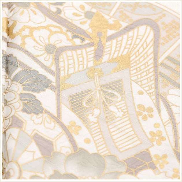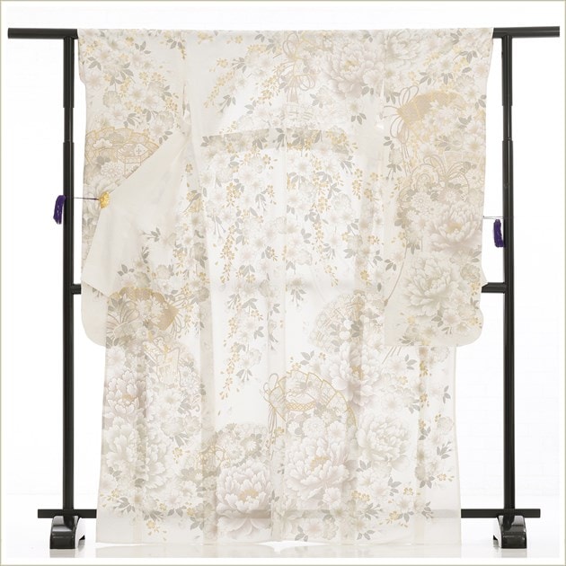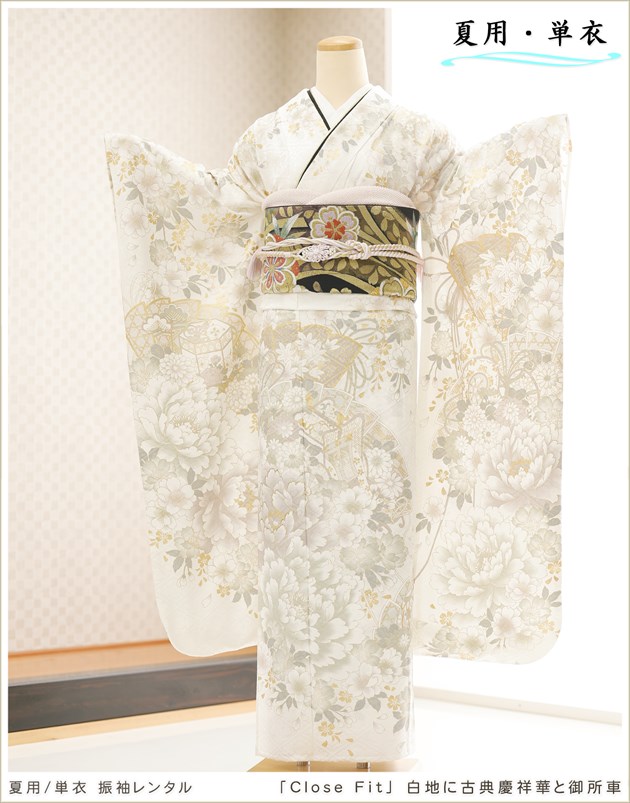 sf8030(「Close Fit」ブランド 白地に古典慶祥華と御所車 /夏用「単衣」振袖レンタル/結婚式/結納)