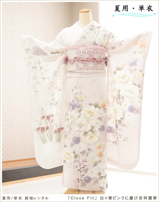 sf8033(「Close Fit」ブランド 白×薄ピンクに慶び吉祥麗華 /夏用「単衣」振袖レンタル/結婚式/結納)