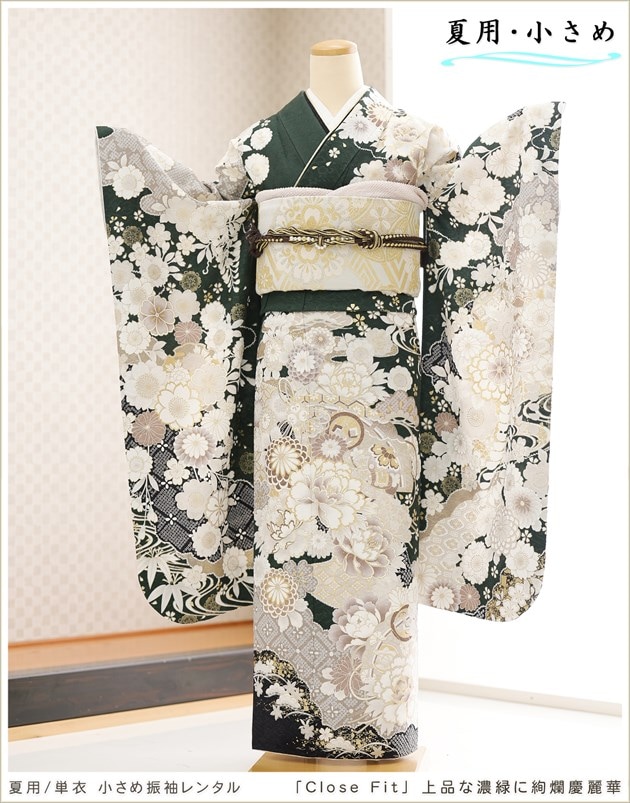 sf8038(「Close Fit」ブランド 上品な濃緑に絢爛慶麗華 /夏用「単衣」振袖レンタル)