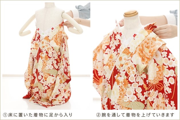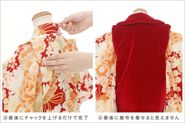 1・足袋を履いて、着物のチャックを広げる 2・着物を置いて足から入る 3・手を通してチャックを一番上まで上げ、被布を着せて完了 (※チャックは型崩れしないように少し硬め仕様になっております。) ※約10秒(最短5秒)で簡単に着付けが可能です