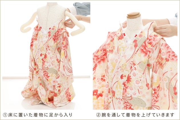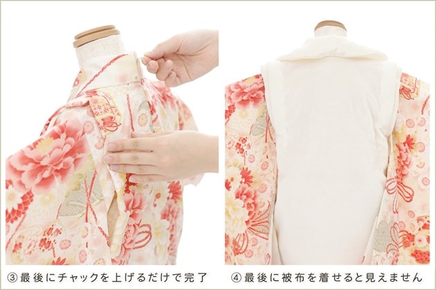 1・足袋を履いて、着物のチャックを広げる 2・着物を置いて足から入る 3・手を通してチャックを一番上まで上げ、被布を着せて完了 (※チャックは型崩れしないように少し硬め仕様になっております。) ※約10秒(最短5秒)で簡単に着付けが可能です