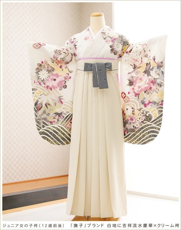 joh5159 (「撫子」ブランド 白地に吉祥流水慶華×クリーム袴 /十三参り・卒業式/女の子ジュニア袴)