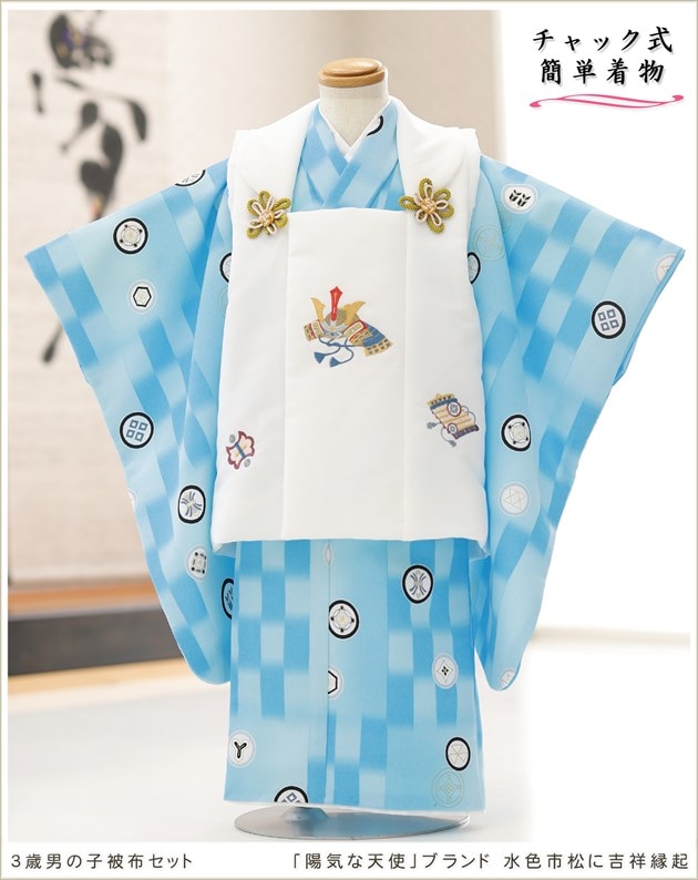 着付けは「チャックを上げるだけ」3歳 七五三 男の子 被布セットレンタル 95cm前後 zdf041 ワンタッチ 新開発 簡単着付け着物 通気性が良く快適 着崩れしない 感動楽チャック着物 753 貸衣装 誕生日 初詣 イベント 子供 ファスナー着物 人気ブランド かわいい 2025「陽気な天使」ブランド 水色市松に吉祥縁起