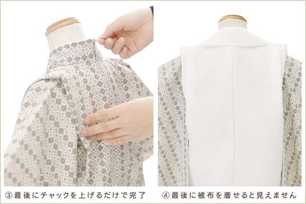 1・足袋を履いて、着物のチャックを広げる 2・着物を置いて足から入る 3・手を通してチャックを一番上まで上げ、被布を着せて完了 (※チャックは型崩れしないように少し硬め仕様になっております。) ※約10秒(最短5秒)で簡単に着付けが可能です ※丈が長い場合は付属のウェストベルトでサイズ調整が可能です