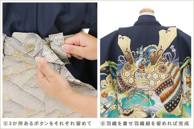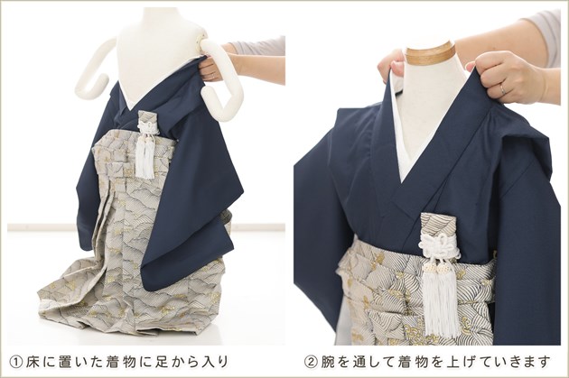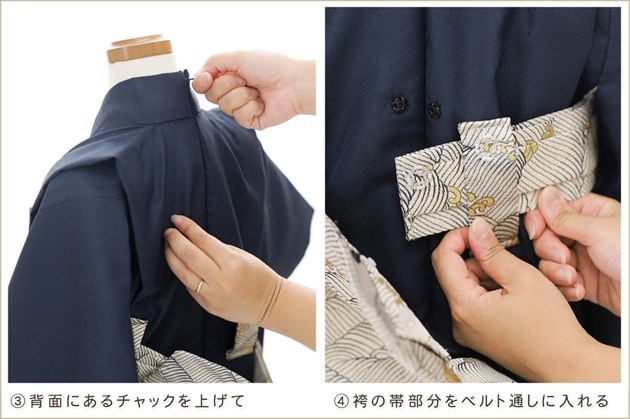 1・足袋を履いて、着物のチャックを広げる 2・着物を置いて足から入る 3・手を通してチャックを一番上まで上げ、袴の紐をベルトを通す 4・3つのボタンを留めて、羽織を着せたら完成! (※チャックは型崩れしないように少し硬め仕様になっております。) ※約90秒で誰でも簡単に着付けが可能です ※付属のサスペンダーで身長に合わせて袴の長さ調整も可能です ◆着せ方の簡易動画はこちらから