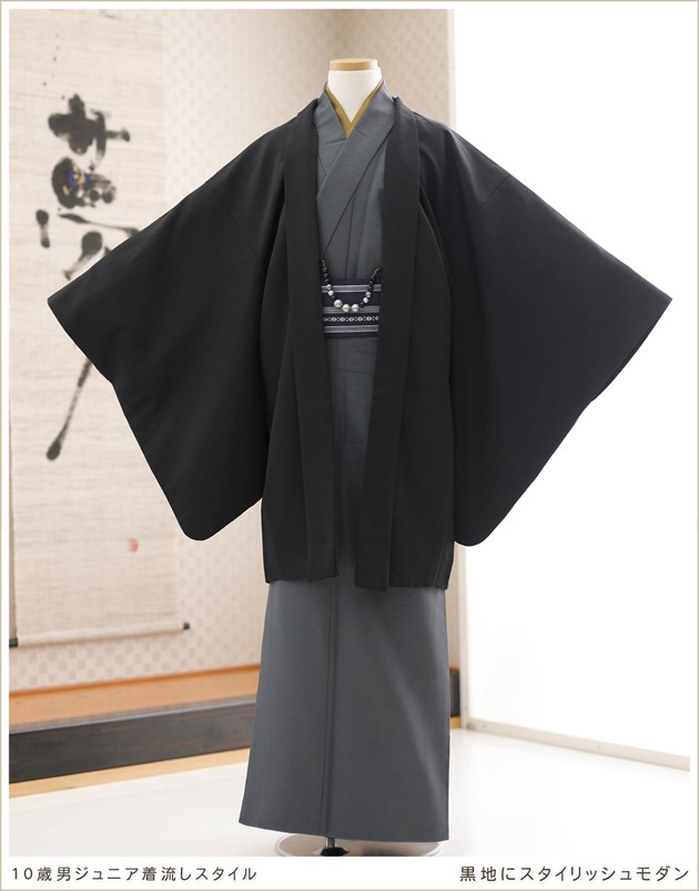 身長150cm前後 感動楽チャック着物 男の子 羽織袴レンタル zjmo004 チャックを上げるだけ ワンタッチ 初めてでも簡単着付け 通気性が良く快適 着崩れない 10歳〜13歳 753 貸衣装 卒業式 初詣 イベント ジュニア着物 人気 スタイルモダンブラック×ライトグレー袴