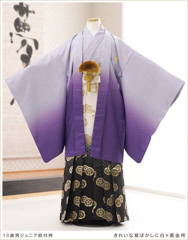 d1107(10歳男の子ジュニア着物 きれいな紫ぼかしに白×黒金袴/羽織袴フルセット)