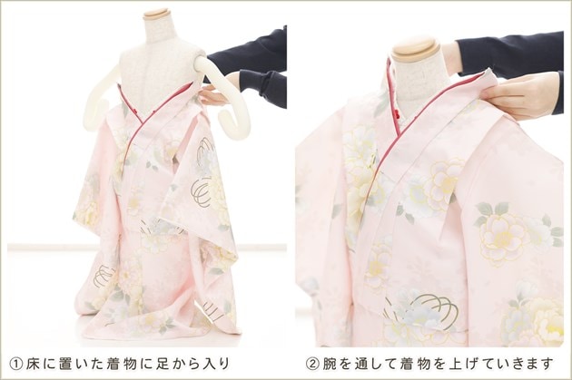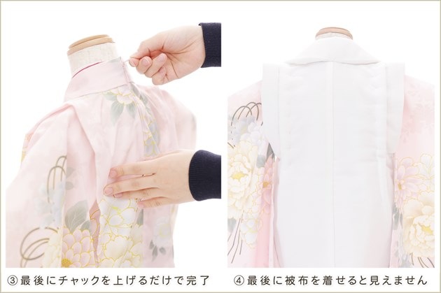 1・足袋を履いて、着物のチャックを広げる 2・着物を置いて足から入る 3・手を通してチャックを一番上まで上げ、被布を着せて完了 (※チャックは型崩れしないように少し硬め仕様になっております。) ※約10秒(最短5秒)で簡単に着付けが可能です ※丈が長い場合は付属のウェストベルトでサイズ調整が可能です