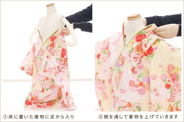 1・足袋を履いて、着物のチャックを広げる 2・着物を置いて足から入る 3・手を通してチャックを一番上まで上げ、被布を着せて完了 (※チャックは型崩れしないように少し硬め仕様になっております。) ※約10秒(最短5秒)で簡単に着付けが可能です ※丈が長い場合は付属のウェストベルトでサイズ調整が可能です