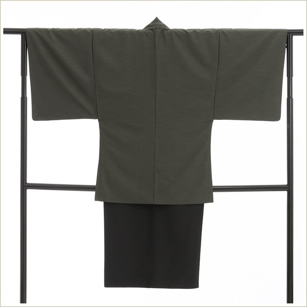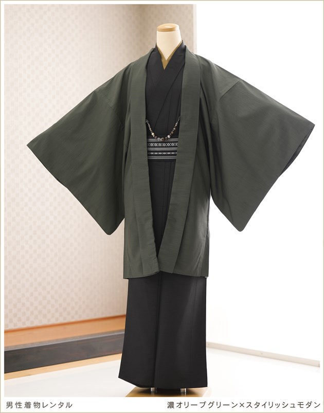 kmo012(男性着物レンタル 濃オリーブグリーン×スタイリッシュモダン/かんたん着付け)