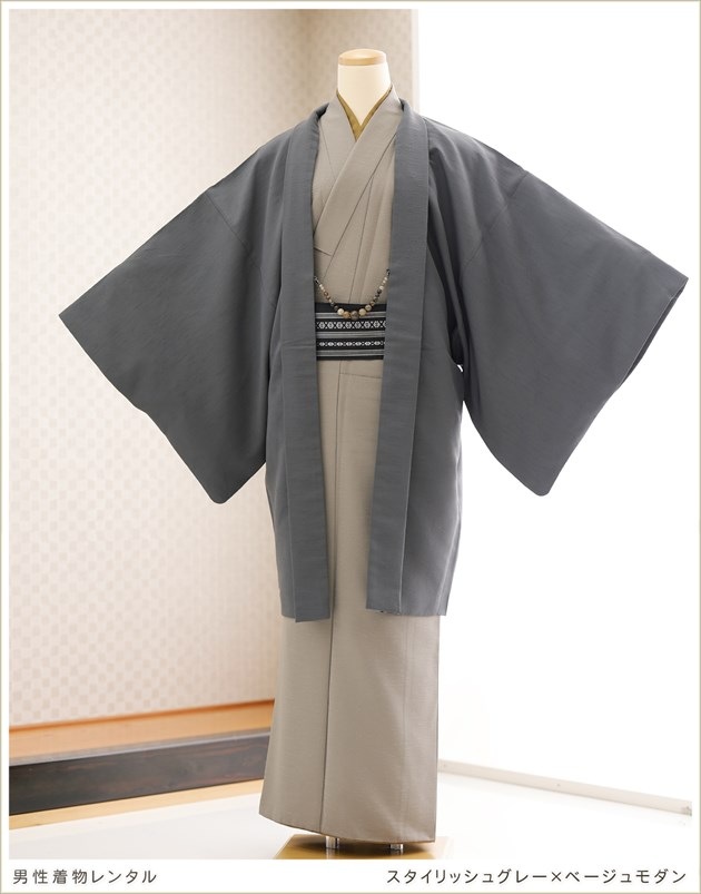 kmo014(男性着物レンタル スタイリッシュグレー×ベージュモダン/かんたん着付け)