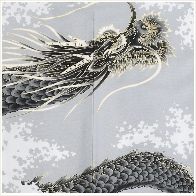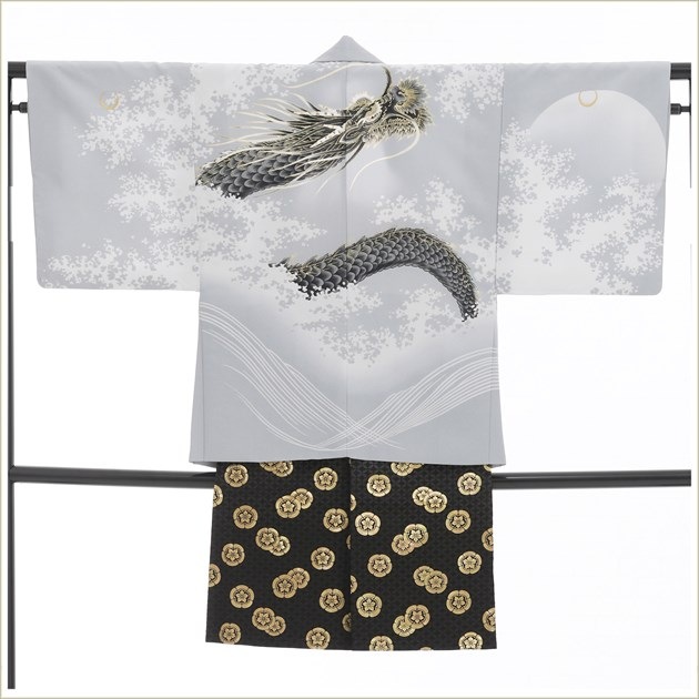 d1108(10歳男の子ジュニア着物 「modern classic」スタイリッシュグレー吉祥無双神龍 /羽織袴フルセット)