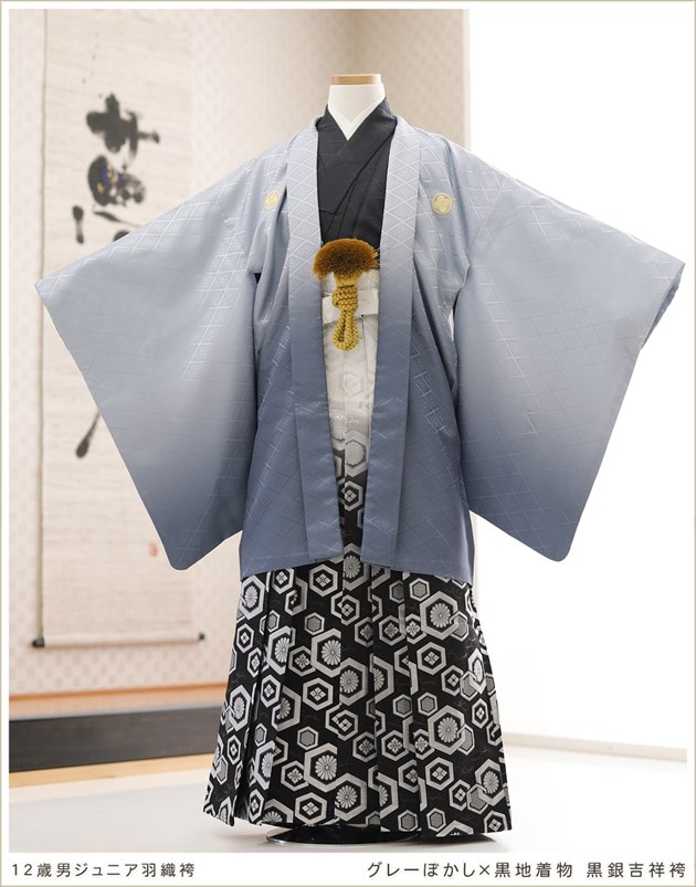 jmo149(小学校卒業式12歳前後 グレーぼかし×黒地着物 黒銀吉祥袴/ジュニア紋付袴)