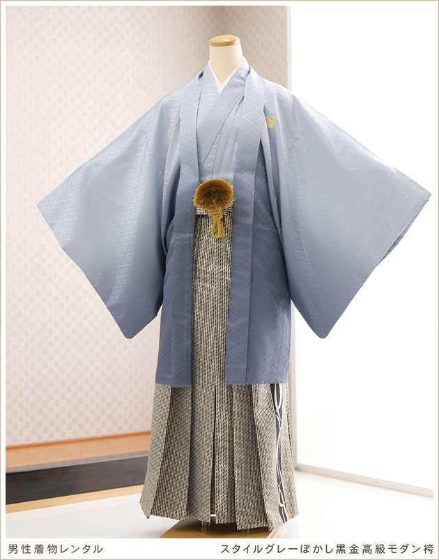 mo288s(スタイルグレーぼかし黒金高級モダン袴 /紋付きフルセット/成人式や正月イベント用)