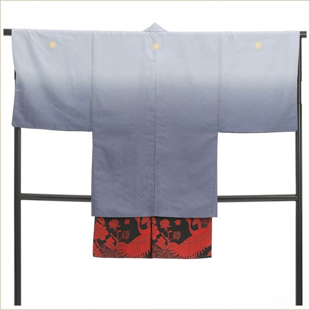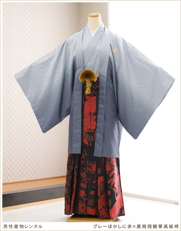 mo296(グレーぼかしに赤×黒飛翔鶴華高級袴 /紋付きフルセット)