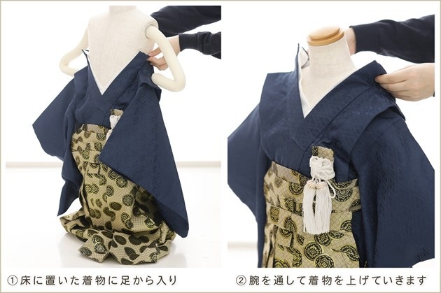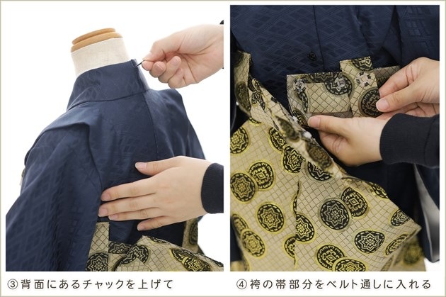 1・足袋を履いて、着物のチャックを広げる 2・着物を置いて足から入る 3・手を通してチャックを一番上まで上げ、袴の紐をベルトを通す 4・3つのボタンを留めて、羽織を着せたら完成! (※チャックは型崩れしないように少し硬め仕様になっております。) ※約90秒で誰でも簡単に着付けが可能です ※付属のサスペンダーで身長に合わせて袴の長さ調整も可能です ◆着せ方の簡易動画はこちらから
