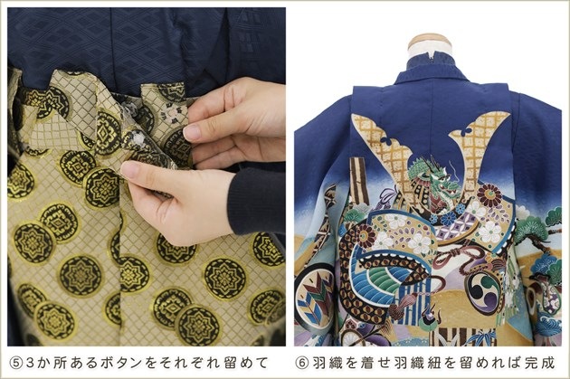初めて着付けをする方でも商品ページの画像を見るだけで簡単に着用いただけますが 画像4番・5番の「袴の留め方について・サスペンダー調整方法」は詳細画像での説明書と動画QRコードを同封しております