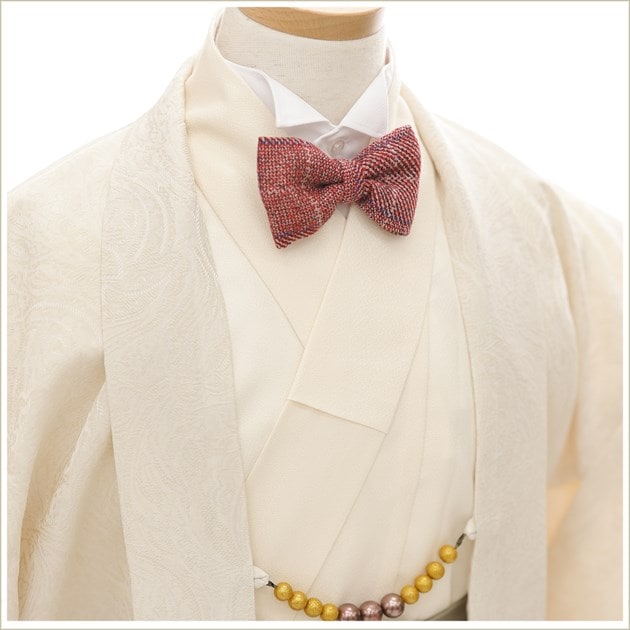 こちらの商品は通常の着物スタイルに加え 着物の下にYシャツを着用いただくことで洋風な蝶ネクタイスタイルとしてもご利用いただけます。 写真撮影とイベント当日で違うスタイルにすることも可能ですので晴れ日の思い出をより多く残してください。 ※蝶ネクタイはワンタッチのタイピン仕様で簡単に位置調整・脱着が可能です。