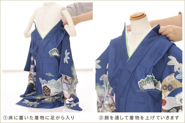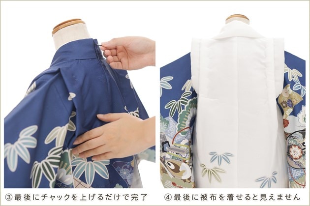 1・足袋を履いて、着物のチャックを広げる 2・着物を置いて足から入る 3・手を通してチャックを一番上まで上げ、被布を着せて完了 (※チャックは型崩れしないように少し硬め仕様になっております。) ※約10秒(最短5秒)で簡単に着付けが可能です