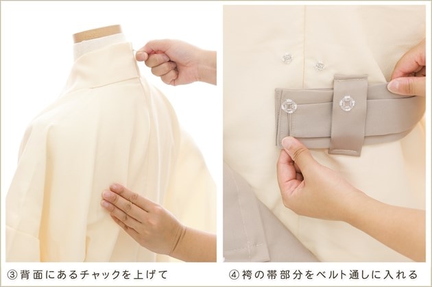 1・足袋を履いて、着物のチャックを広げる 2・着物を置いて足から入る 3・手を通してチャックを一番上まで上げ、袴の紐をベルトを通す 4・3つのボタンを留めて、羽織を着せたら完成! (※チャックは型崩れしないように少し硬め仕様になっております。) ※約90秒で誰でも簡単に着付けが可能です ※付属のサスペンダーで身長に合わせて袴の長さ調整も可能です ◆着せ方の簡易動画はこちらから
