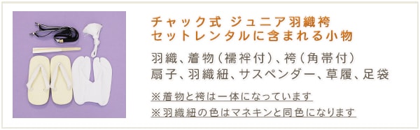 羽織、着物(襦袢付)袴、角帯、草履、足袋、扇子、羽織紐、サスペンダー ※チャックを上げるだけの簡単着付け