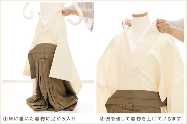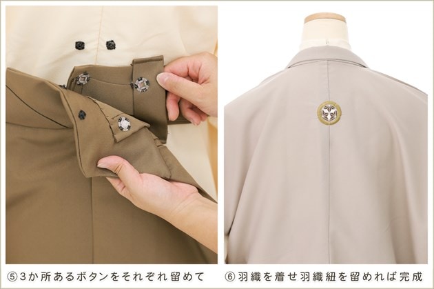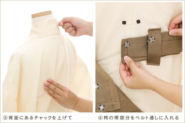 1・足袋を履いて、着物のチャックを広げる 2・着物を置いて足から入る 3・手を通してチャックを一番上まで上げ、袴の紐をベルトを通す 4・3つのボタンを留めて、羽織を着せたら完成! (※チャックは型崩れしないように少し硬め仕様になっております。) ※約90秒で誰でも簡単に着付けが可能です ※付属のサスペンダーで身長に合わせて袴の長さ調整も可能です ◆着せ方の簡易動画はこちらから