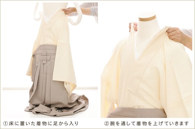 1・足袋を履いて、着物のチャックを広げる 2・着物を置いて足から入る 3・手を通してチャックを一番上まで上げ、袴の紐をベルトを通す 4・3つのボタンを留めて、羽織を着せたら完成! (※チャックは型崩れしないように少し硬め仕様になっております。) ※約90秒で誰でも簡単に着付けが可能です ※付属のサスペンダーで身長に合わせて袴の長さ調整も可能です ◆着せ方の簡易動画はこちらから
