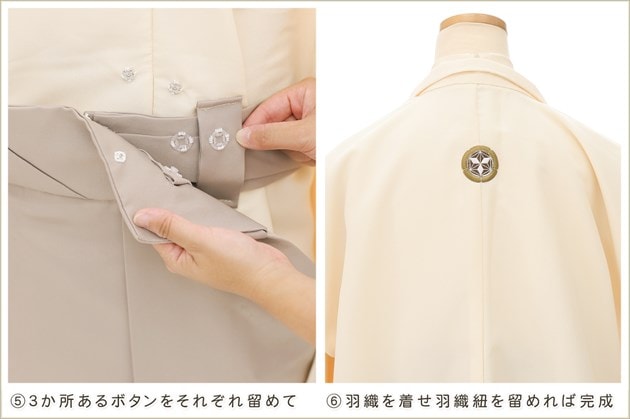 初めて着付けをする方でも商品ページの画像を見るだけで簡単に着用いただけますが 画像4番・5番の「袴の留め方について・サスペンダー調整方法」は詳細画像での説明書と動画QRコードを同封しております