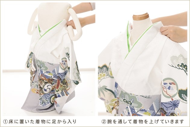 1・足袋を履いて、着物のチャックを広げる 2・着物を置いて足から入る 3・手を通してチャックを一番上まで上げ、被布を着せて完了 (※チャックは型崩れしないように少し硬め仕様になっております。) ※約10秒(最短5秒)で簡単に着付けが可能です ※丈が長い場合は付属のウェストベルトでサイズ調整が可能です