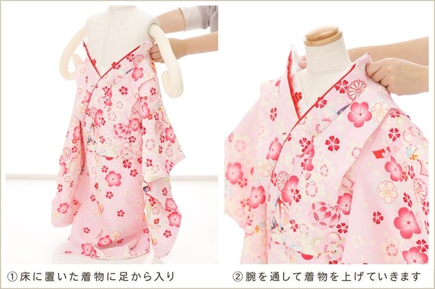 1・足袋を履いて、着物のチャックを広げる 2・着物を置いて足から入る 3・手を通してチャックを一番上まで上げ、被布を着せて完了 (※チャックは型崩れしないように少し硬め仕様になっております。) ※約10秒(最短5秒)で簡単に着付けが可能です ※丈が長い場合は付属のウェストベルトでサイズ調整が可能です