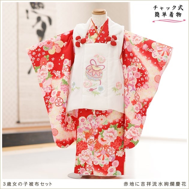 感動楽チャック着物「着付けは簡単チャックを上げるだけ」3歳 七五三 女の子 被布セットレンタル zf0115 ワンタッチ 95cm前後 通気性が良く快適 着崩れしない 753 貸衣装 誕生日 初詣 イベント 子供着物 人気 かわいい 赤地に流水ぼかし慶祝華