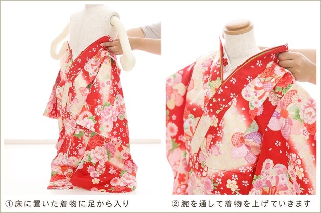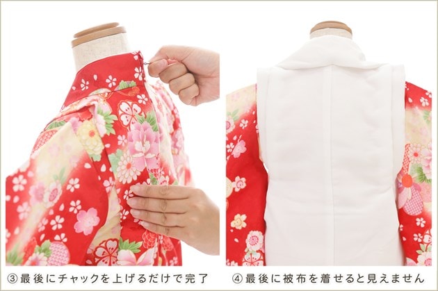 1・足袋を履いて、着物のチャックを広げる 2・着物を置いて足から入る 3・手を通してチャックを一番上まで上げ、被布を着せて完了 (※チャックは型崩れしないように少し硬め仕様になっております。) ※約10秒(最短5秒)で簡単に着付けが可能です ※丈が長い場合は付属のウェストベルトでサイズ調整が可能です