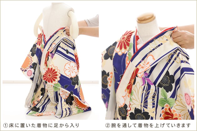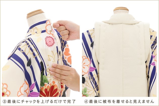 1・足袋を履いて、着物のチャックを広げる 2・着物を置いて足から入る 3・手を通してチャックを一番上まで上げ、被布を着せて完了 (※チャックは型崩れしないように少し硬め仕様になっております。) ※約10秒(最短5秒)で簡単に着付けが可能です ※丈が長い場合は付属のウェストベルトでサイズ調整が可能です