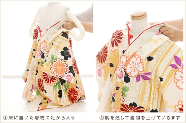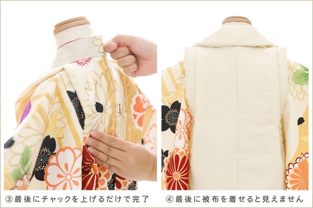 1・足袋を履いて、着物のチャックを広げる 2・着物を置いて足から入る 3・手を通してチャックを一番上まで上げ、被布を着せて完了 (※チャックは型崩れしないように少し硬め仕様になっております。) ※約10秒(最短5秒)で簡単に着付けが可能です ※丈が長い場合は付属のウェストベルトでサイズ調整が可能です
