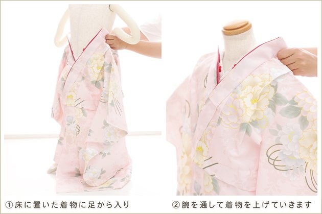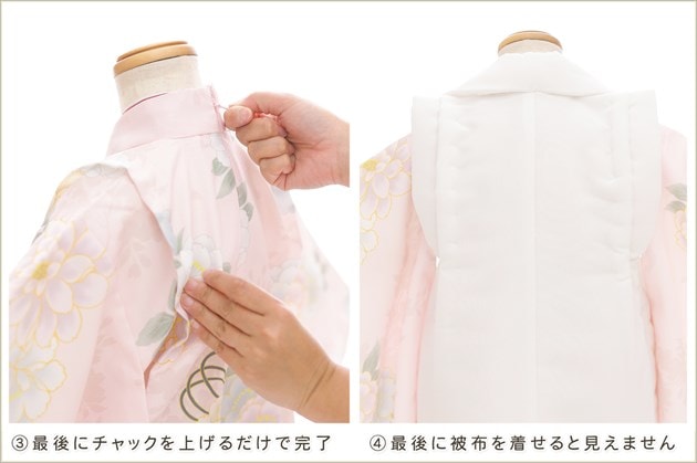 1・足袋を履いて、着物のチャックを広げる 2・着物を置いて足から入る 3・手を通してチャックを一番上まで上げ、被布を着せて完了 (※チャックは型崩れしないように少し硬め仕様になっております。) ※約10秒(最短5秒)で簡単に着付けが可能です ※丈が長い場合は付属のウェストベルトでサイズ調整が可能です