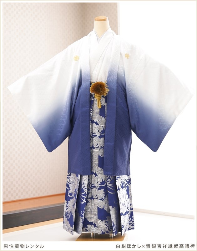 卒業式 紋付袴レンタル 七五三 お宮参り mo286 メンズ 羽織袴 男 フルセット 着物レンタル 袴レンタル 男性着物 貸衣装 kimono 前撮り イベント 和服 白紺ぼかし×青銀吉祥縁起高級袴