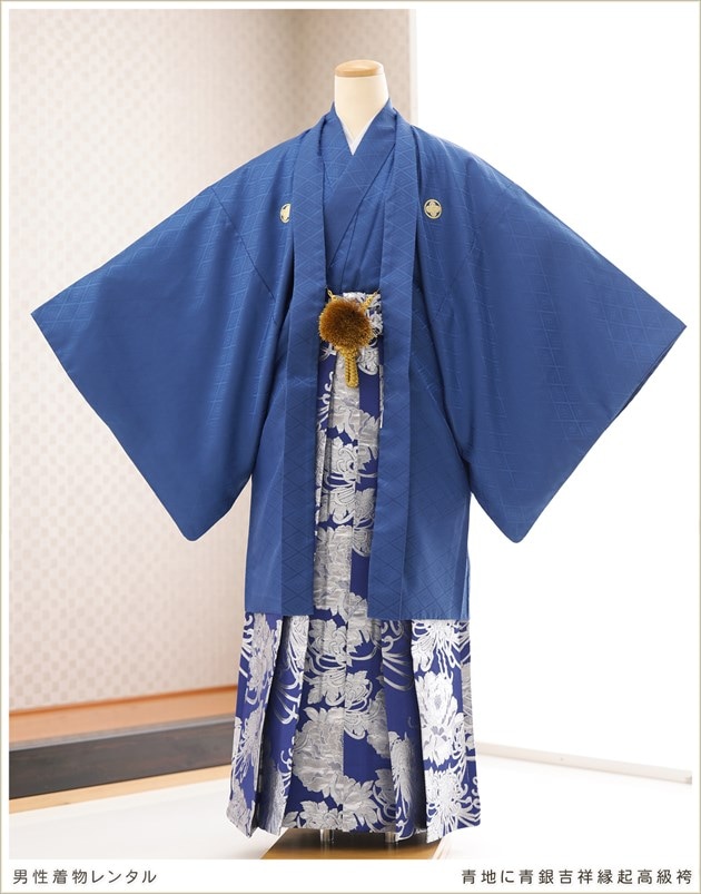 卒業式 紋付袴レンタル 七五三 お宮参り mo285 メンズ 羽織袴 男 フルセット 着物レンタル 袴レンタル 男性着物 貸衣装 kimono 前撮り イベント 和服 青地に青銀吉祥縁起高級袴