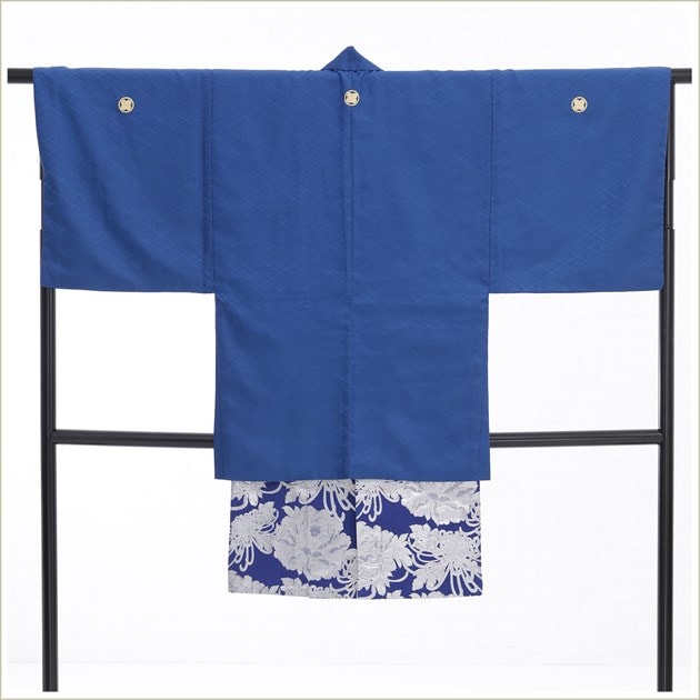 mo286(青地に青銀吉祥縁起高級袴 /紋付きフルセット)