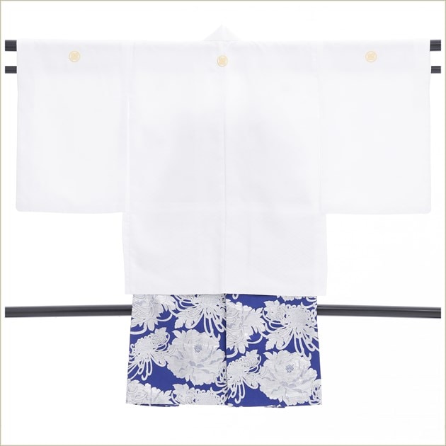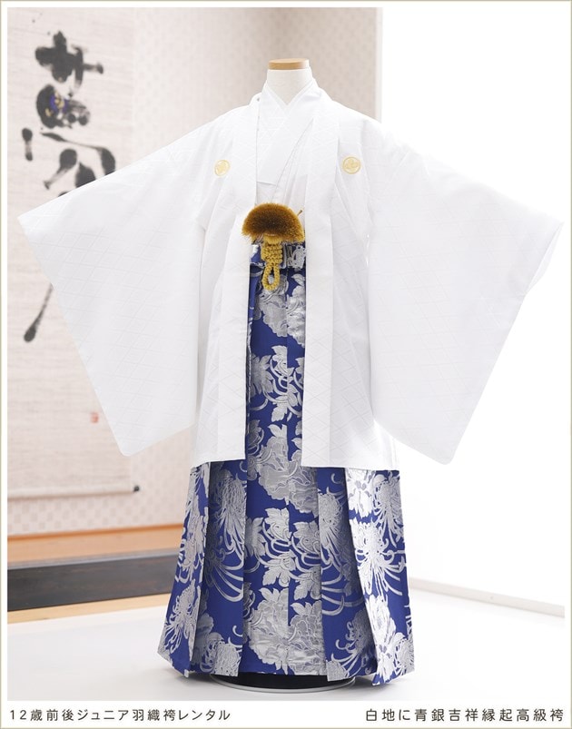 jmo157(12歳前後ジュニア用 白地に青銀吉祥縁起高級袴 /紋付きフルセット)
