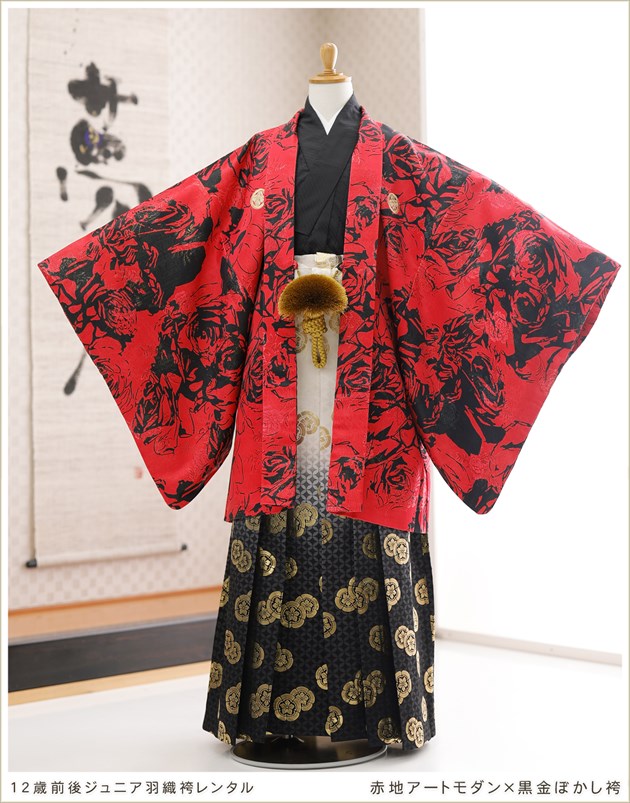 身長高め 157cm〜167cm対応 小学校卒業式 ジュニア 男の子 紋付袴レンタル 十三参り 小学生 jbmo080-4 メンズ 12歳前後 羽織袴 フルセット 着物レンタル 貸衣装 kimono イベント 高級ブランド「モダンクラシック」 赤黒ぼかし×黒金亀甲袴